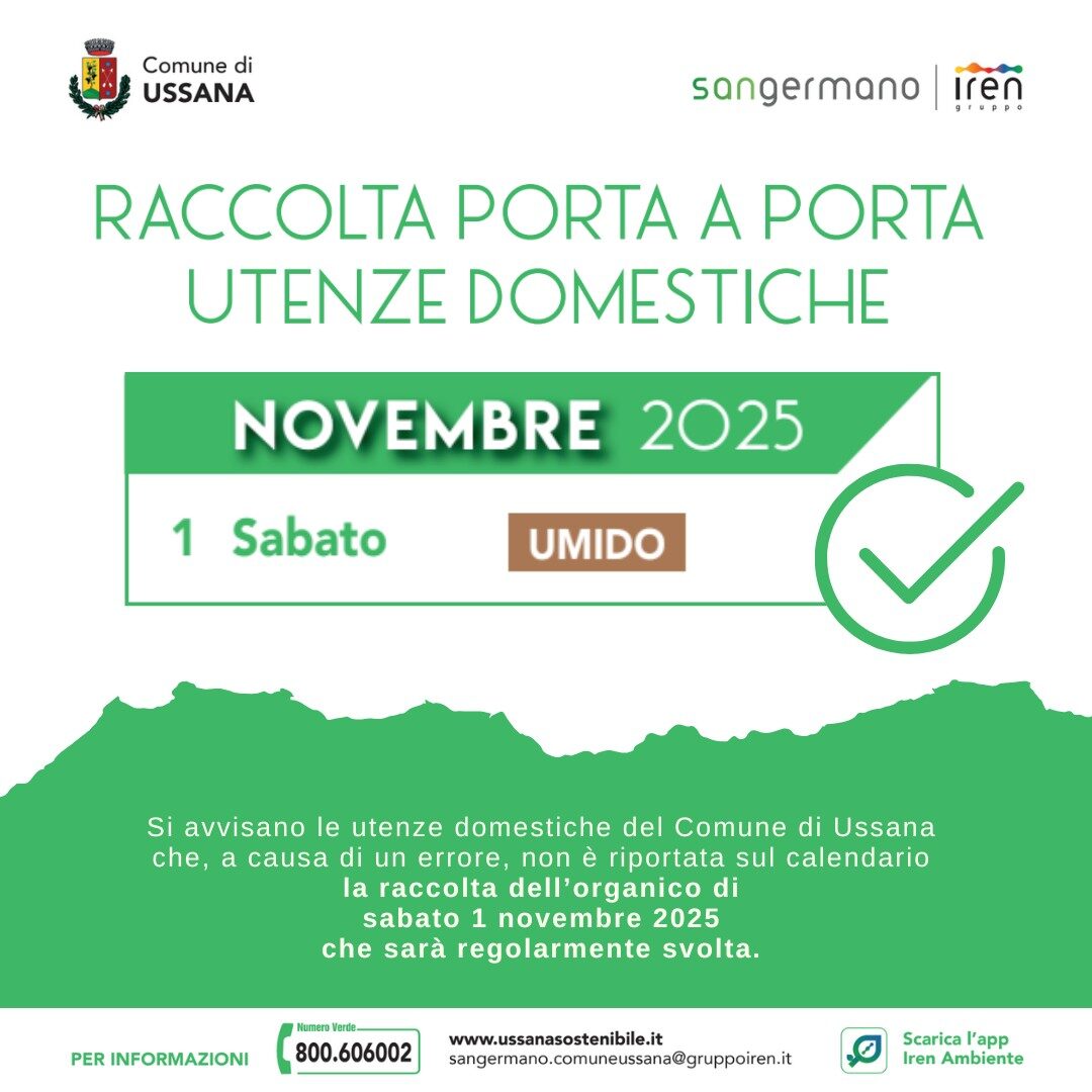 Si avvisano le utenze domestiche del Comune di Ussana che, a causa di un errore, sul calendario non è riportata la raccolta dell’organico di sabato 1 novembre 2025 che sarà regolarmente svolta.